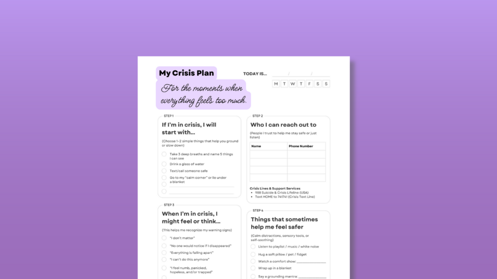 This printable crisis plan worksheet gives you a way to prepare in calm moments — so when everything feels too big, you already have a path back to safety and support.