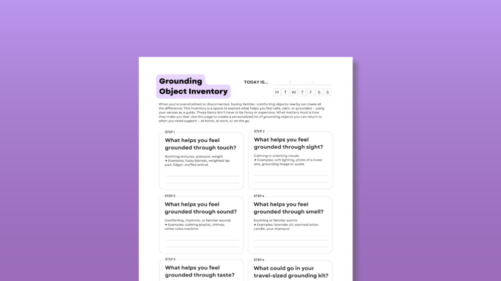 When you’re overwhelmed, shut down, or overstimulated, having familiar objects nearby can be a lifeline. This printable worksheet helps you explore what makes you feel grounded—through touch, sight, sound, taste, and smell—so you can build a personalized kit of supportive tools to keep close.