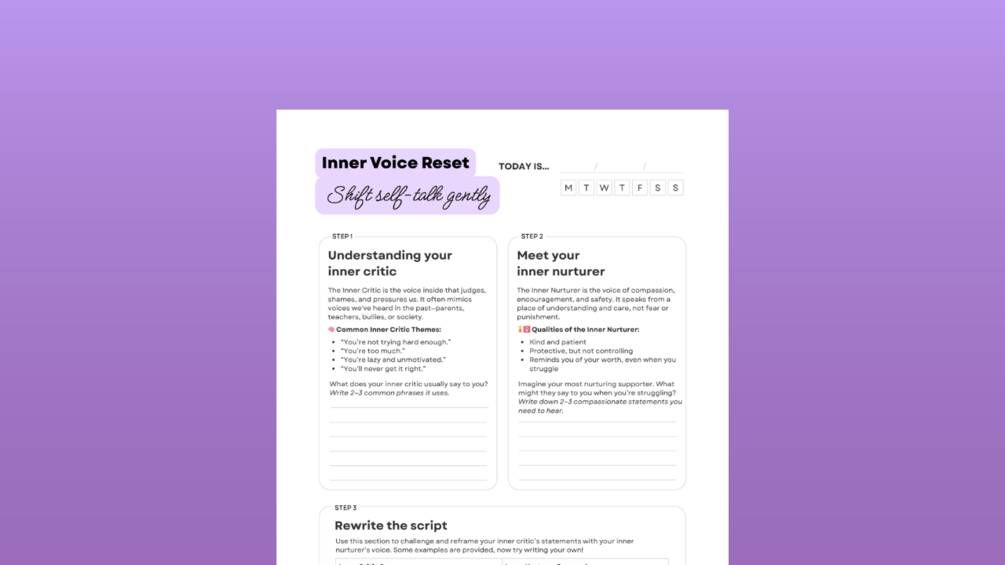 This gentle, one-page worksheet helps you shift from critical self-talk to supportive inner dialogue — without forcing positivity or pretending everything’s fine.